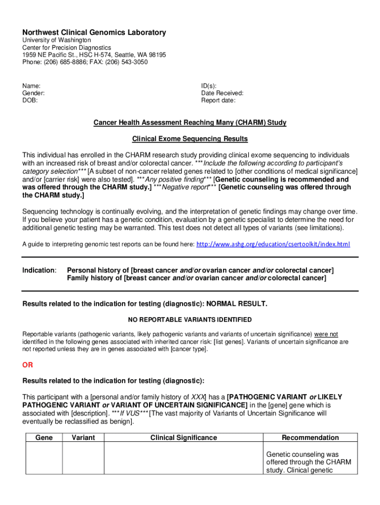 Northwest Clinical Genomics Laboratory University of Washington Center for Precision Diagnostics 1959 NE Pacific St., HSC H574, Seattle, WA 98195 Phone: (206) 6858886; FAX: (206) 5433050Name: Gender: