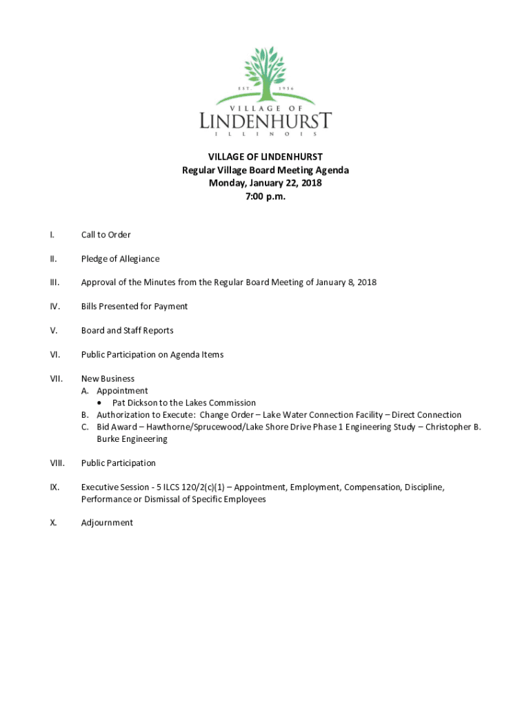 VILLAGE OF LINDENHURST Regular Village Board Meeting Agenda Monday, January 22, 2018 7:00 p.m.I. Call to Order. Pledge of Allegiance. Approval of the Minutes from the Regular Board Meeting of January