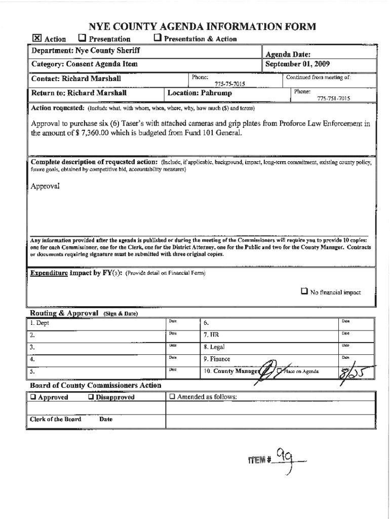 NYE COUNTY AGENDA INFORMATION FORM U Presentation & Action U Presentation lxi Action Department: NYC County SheriffAgenda Date: September 01, 2009Category: Consent Agenda Item Phone:Contact: Richard