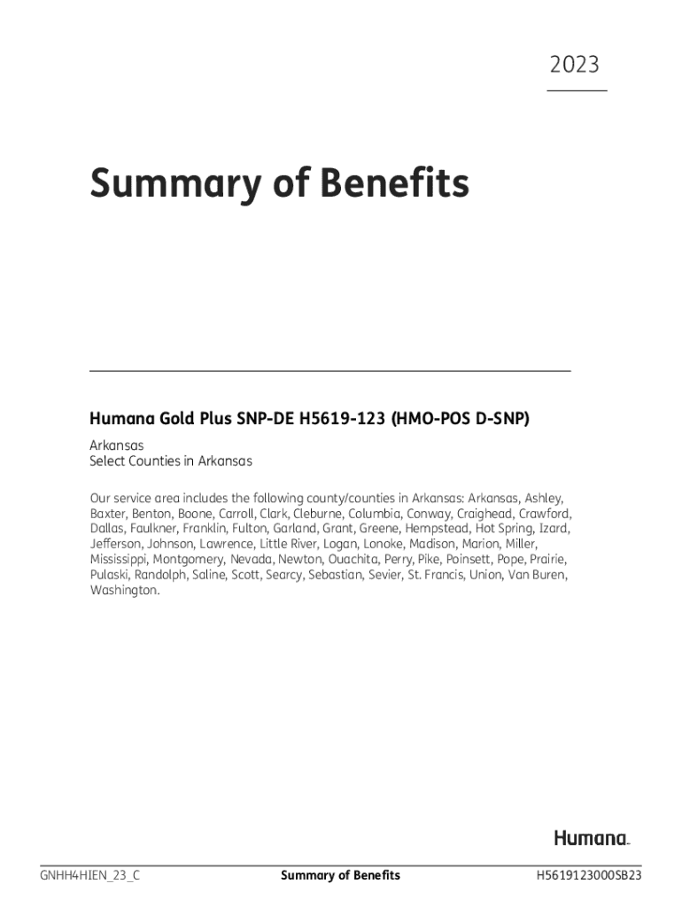 SBOSB0332023Summary of BenefitsHumana Gold Plus SNIDE H5619123 (HMO POS DSP) Arkansas Select Counties in Arkansas Our service area includes the following county/counties in Arkansas: Arkansas, Ashley,