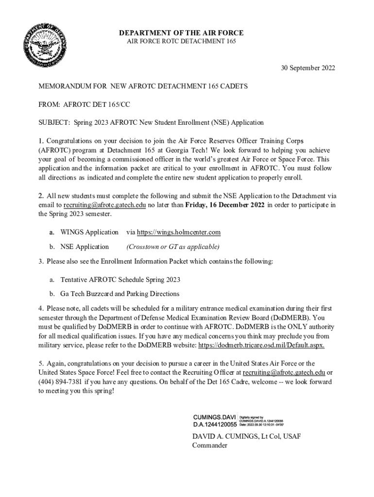 DEPARTMENT OF THE AIR FORCE ROTC DETACHMENT 16530 September 2022 MEMORANDUM FOR NEW AF ROTC DETACHMENT 165 CADETS FROM: AF ROTC DET 165/CC SUBJECT: Spring 2023 AF ROTC New Student Enrollment (USE)