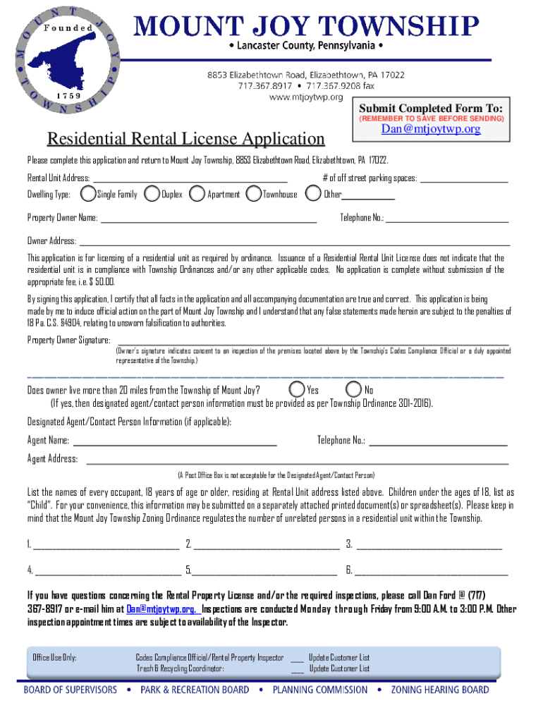 Submit Completed Form To: (REMEMBER TO SAVE BEFORE SENDING)Dan@mtjoytwp.orgResidential Rental License ApplicationPlease complete this application and return to Mount Joy Township, 8853 Elizabethtown