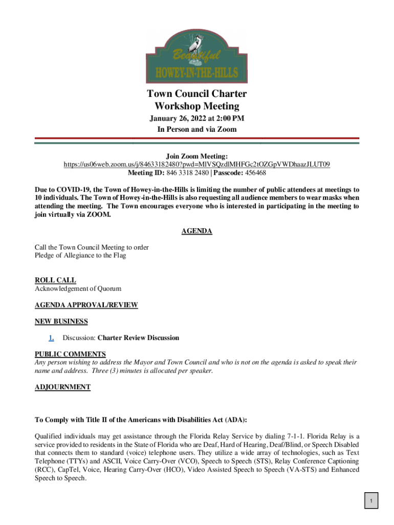 Town Council Charter Workshop Meeting January 26, 2022, at 2:00 PM In Person and via Boomtown Zoom Meeting: https://us06web.zoom.us/j/84633182480?pwdMlVSQzdlMHFGc2tOZGpVWDhaazJLUT09 Meeting ID: 846