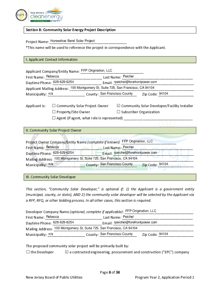 Section B: Community Solar Energy Project Description Horseshoe Bend Solar Project Name: ___ *This name will be used to reference the project in correspondence with the Applicant. I. Applicant Contact