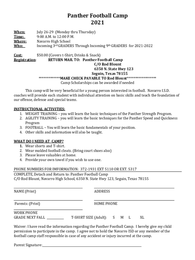 Panther Football Camp 2021 When: Time: Where: Who:July 2629 (Monday through Thursday) 9:00 A.M. to 12:00 P.M. Navarro High School Incoming 3rd GRADERS Through Incoming 9th GRADERS for 20212022Cost: