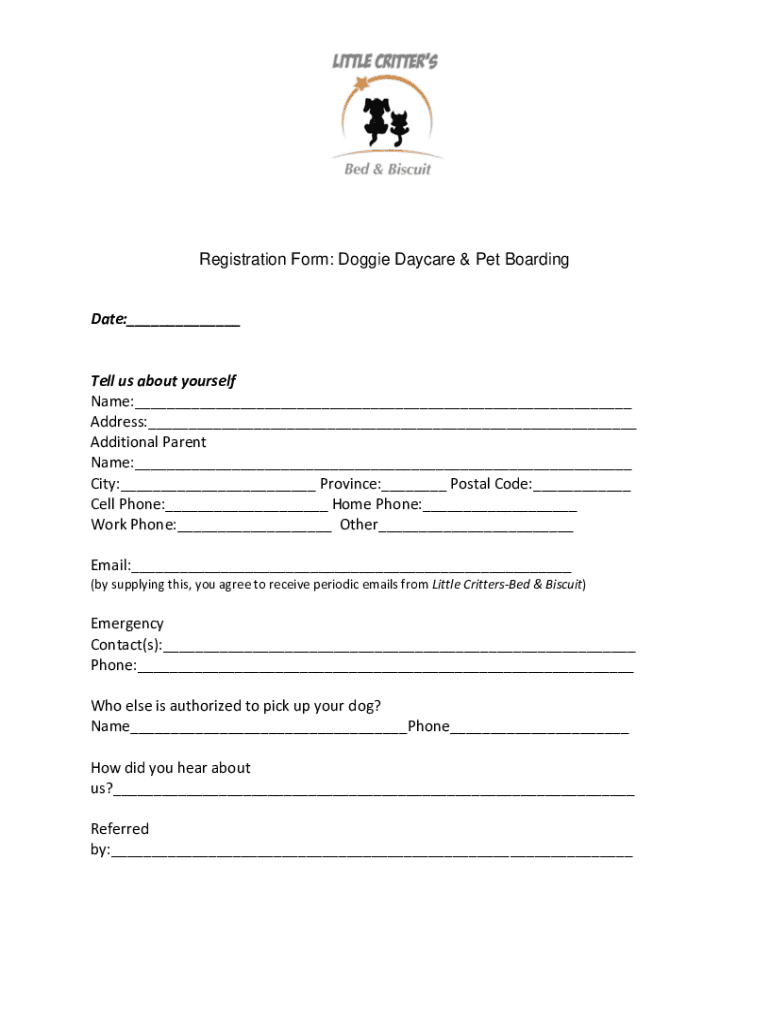 Registration Form: Dog Daycare & Pet BoardingDate:___Tell us about yourself Name:___ Address:___ Additional Parent Name:___ City:___ Province:___ Postal Code:___ Cell Phone:___ Home Phone:___ Work