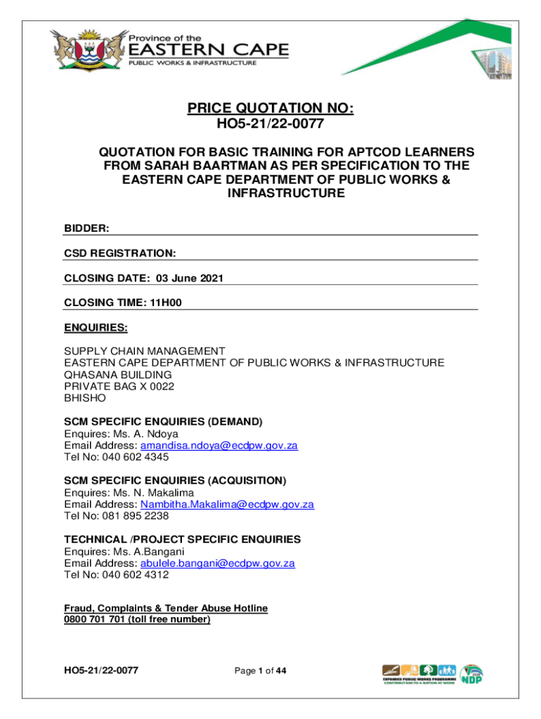 PRICE QUOTATION NO: HO521/220077 QUOTATION FOR BASIC TRAINING FOR APT COD LEARNERS FROM SARAH BATMAN AS PER SPECIFICATION TO THE EASTERN CAPE DEPARTMENT OF PUBLIC WORKS & INFRASTRUCTURE BIDDER: CSD