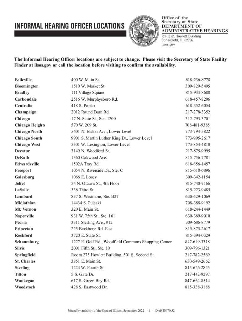 INFORMAL HEARING OFFICER LOCATIONSOffice of the Secretary of State DEPARTMENT OF ADMINISTRATIVE HEARINGS Rm. 212, Hewlett Building Springfield, IL 62756 also. Goethe Informal Hearing Officer locations