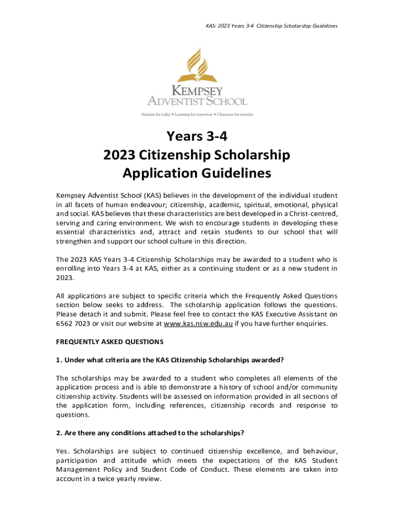 WAS: 2023 Years 34 Citizenship Scholarship GuidelinesYears 34 2023 Citizenship Scholarship Application Guidelines Dempsey Adventist School (WAS) believes in the development of the individual student
