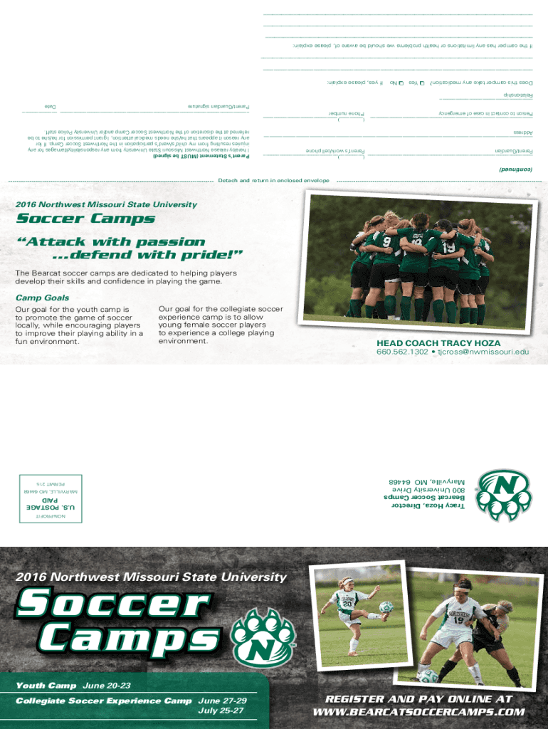 Collegiate Soccer Experience Camp June 2729July 2527REGISTER AND PAY ONLINE AT WWW.BEARCATSOCCERCAMPS. Mouth Camp June 2023Soccer Camps2016 Northwest Missouri State University NONPROFIT Tracy Hora,