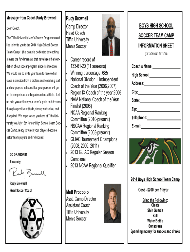 Message from Coach Rudy Brown ell: Dear Coach, The Tiffing University Men Soccer Program would like to invite you to the 2014 High School Soccer Rudy Brown ell Camp Director Head Coach Tiffing University