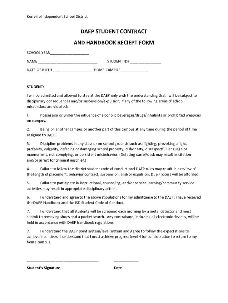 Kerrville Independent School DistrictDAEP STUDENT CONTRACT AND HANDBOOK RECENT FORM SCHOOL YEAR___ NAME ___STUDENT ID# ___DATE OF BIRTH ___ HOME CAMPUS ___STUDENT: I will be admitted and allowed to
