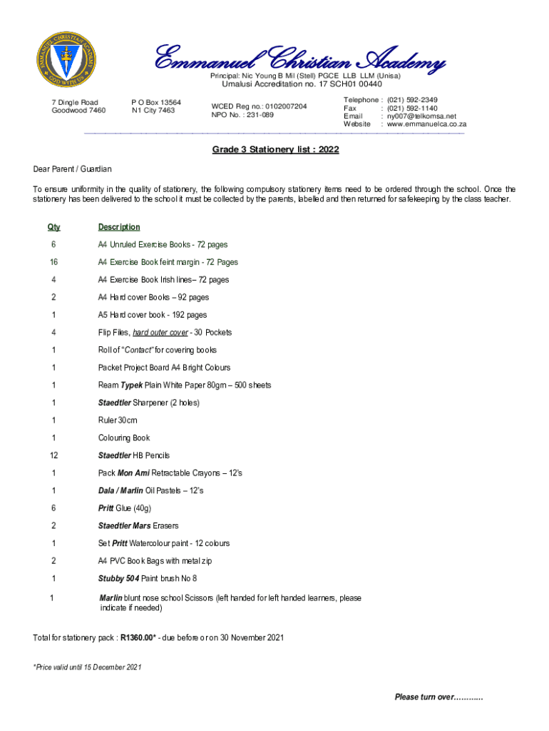 Emmanuel Christian Academy Principal: NIC Young B Mil (Still) PGCE LLB ELM (UNIMA)Males Accreditation no. 17 SCH01 00440 7 Dingle Road Good wood 7460P O Box 13564 N1 City 7463WCED Reg no.: 0102007204
