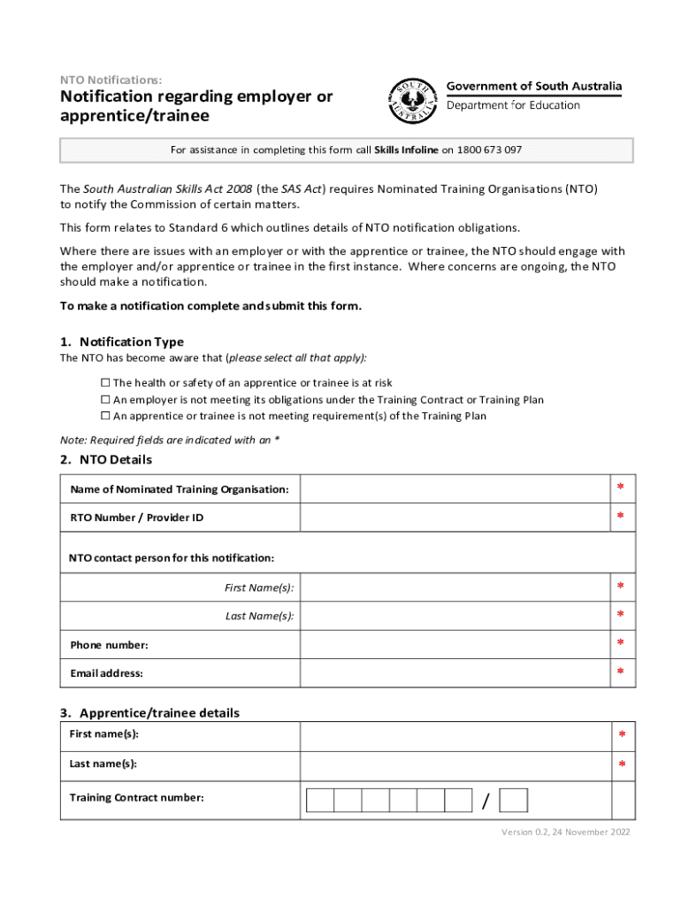 Notifications:Notificationregardingemployeror apprentice/trainee ForassistanceincompletingthisformcallSkillsInfolineon1800673097TheSouthAustralianSkillsAct2008(pheasant)requiresNominatedTrainingOrganisations(TO)