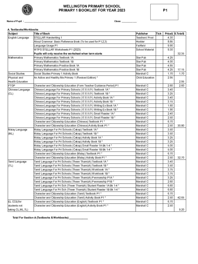 Get the free WELLINGTON PRIMARY SCHOOL PRIMARY 1 BOOKLIST ... - wellingtonpri moe edu