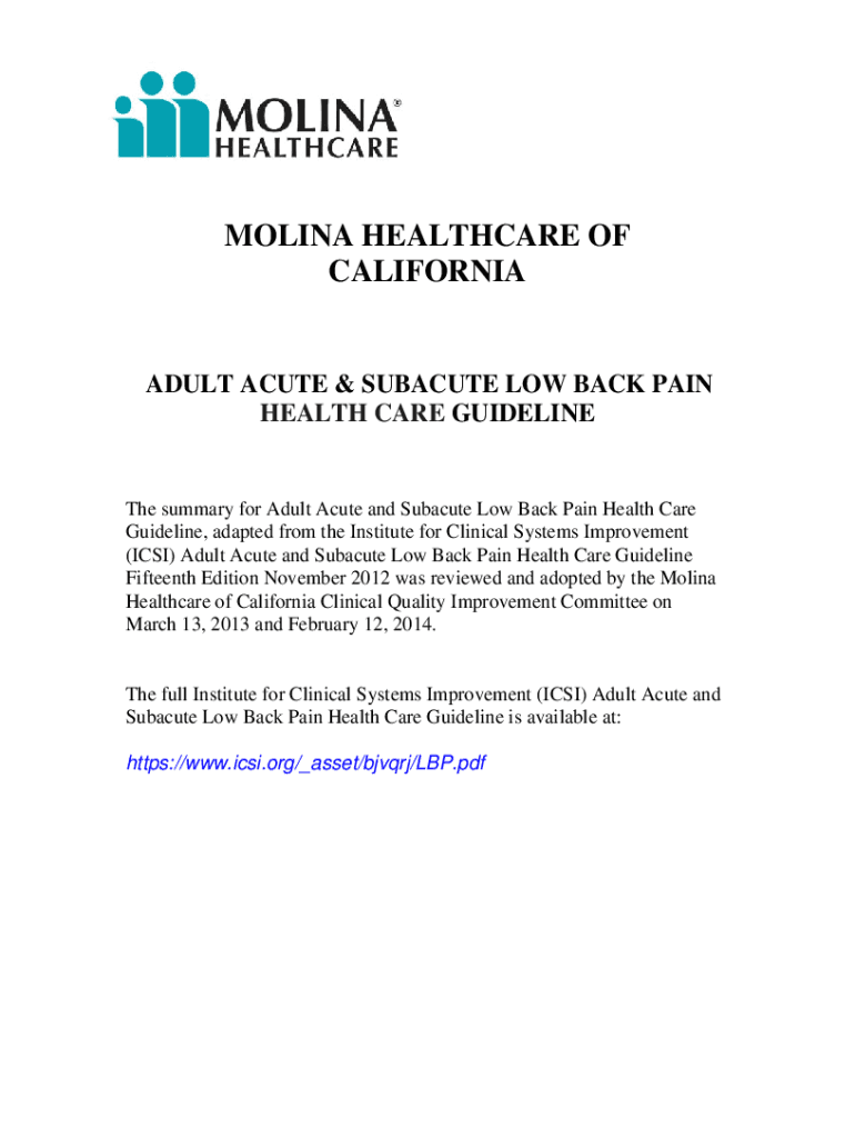 MOLINA HEALTHCARE OF CALIFORNIAADULT ACUTE & SUBACUTE LOW BACK PAIN HEALTH CARE Guidelines summary for Adult Acute and Subacute Low Back Pain Health Care Guideline, adapted from the Institute for