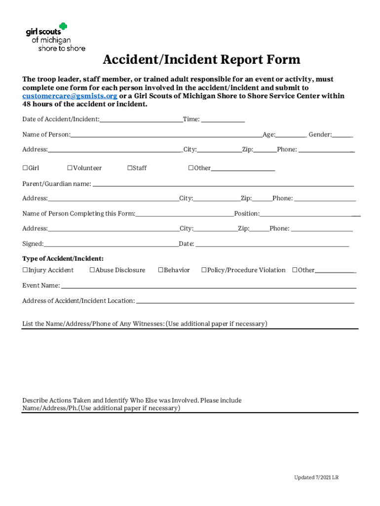 Get the free Accident/Incident Report Form - Girl Scouts San Diego