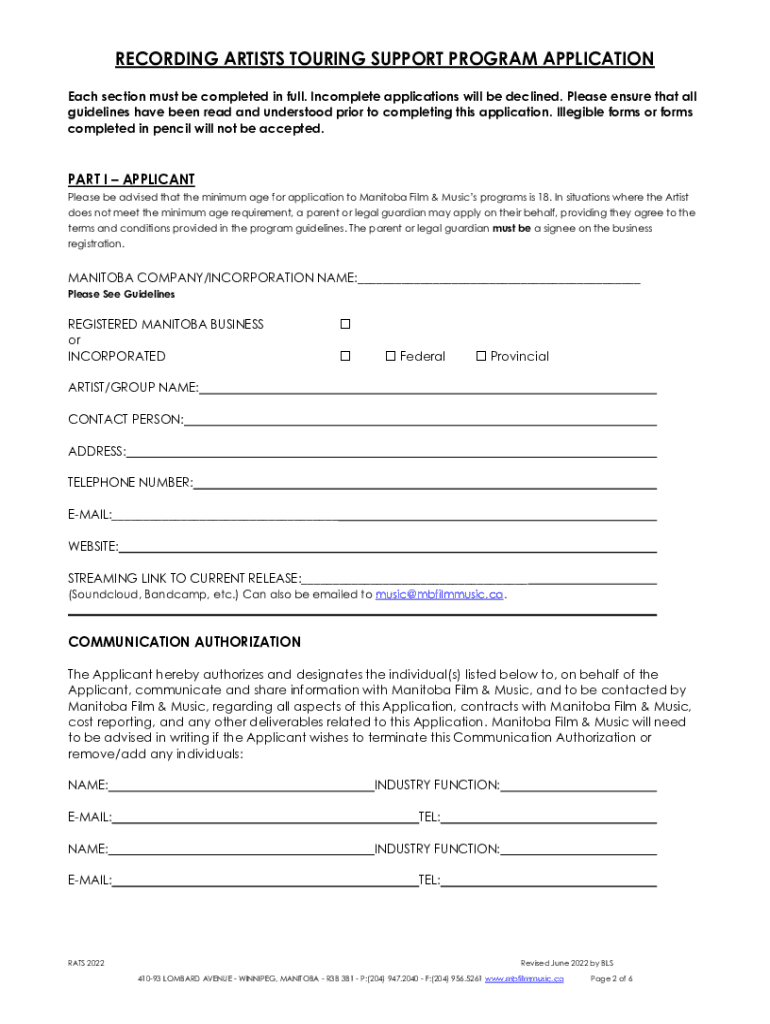 This document is available in alternate formats upon request. RECORDING ARTISTS TOURING SUPPORT PROGRAM CHECKLIST Emailed applications: All applications must be emailed to music@mbfilmmusic.ca prior