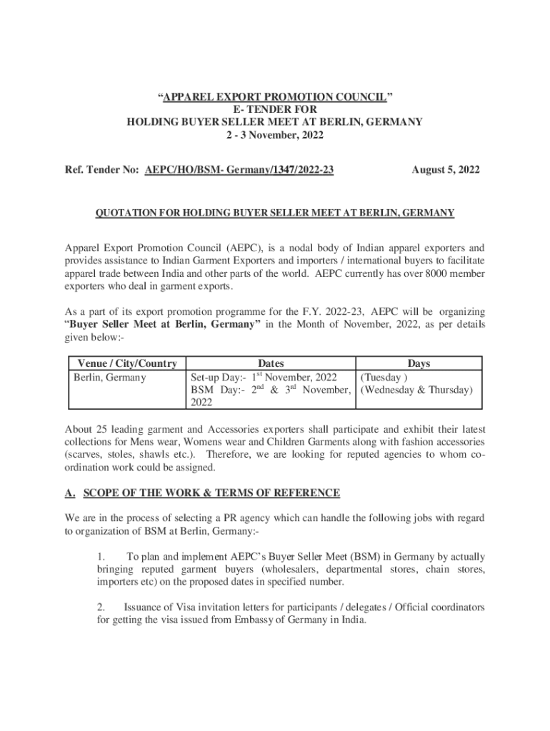 APPAREL EXPORT PROMOTION COUNCIL E TENDER FOR HOLDING BUYER SELLER MEET AT BERLIN, GERMANY 2 3 November 2022 Ref. Tender No: APC/HO/BSM Germany/1347/202223August 5, 2022QUOTATION FOR HOLDING BUYER