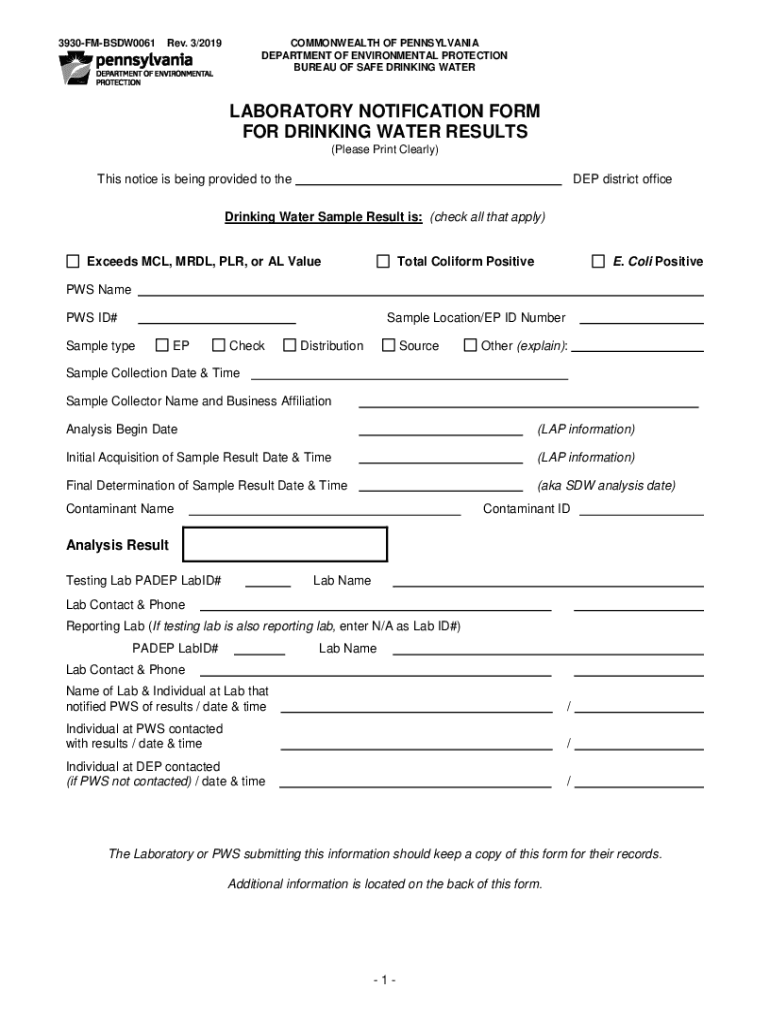 3930FMBSDW0061Rev. 3/2019COMMONWEALTH OF PENNSYLVANIA DEPARTMENT OF ENVIRONMENTAL PROTECTION BUREAU OF SAFE DRINKING WATERLABORATORY NOTIFICATION FORM FOR DRINKING WATER RESULTS (Please Print Clearly)This