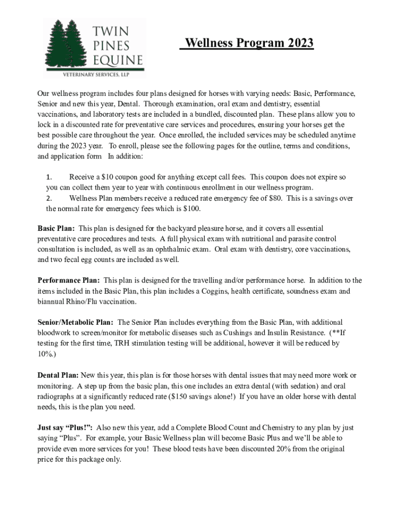 Wellness Program 2023Our wellness program includes four plans designed for horses with varying needs: Basic, Performance, Senior and new this year, Dental. Thorough examination, oral exam and dentistry,