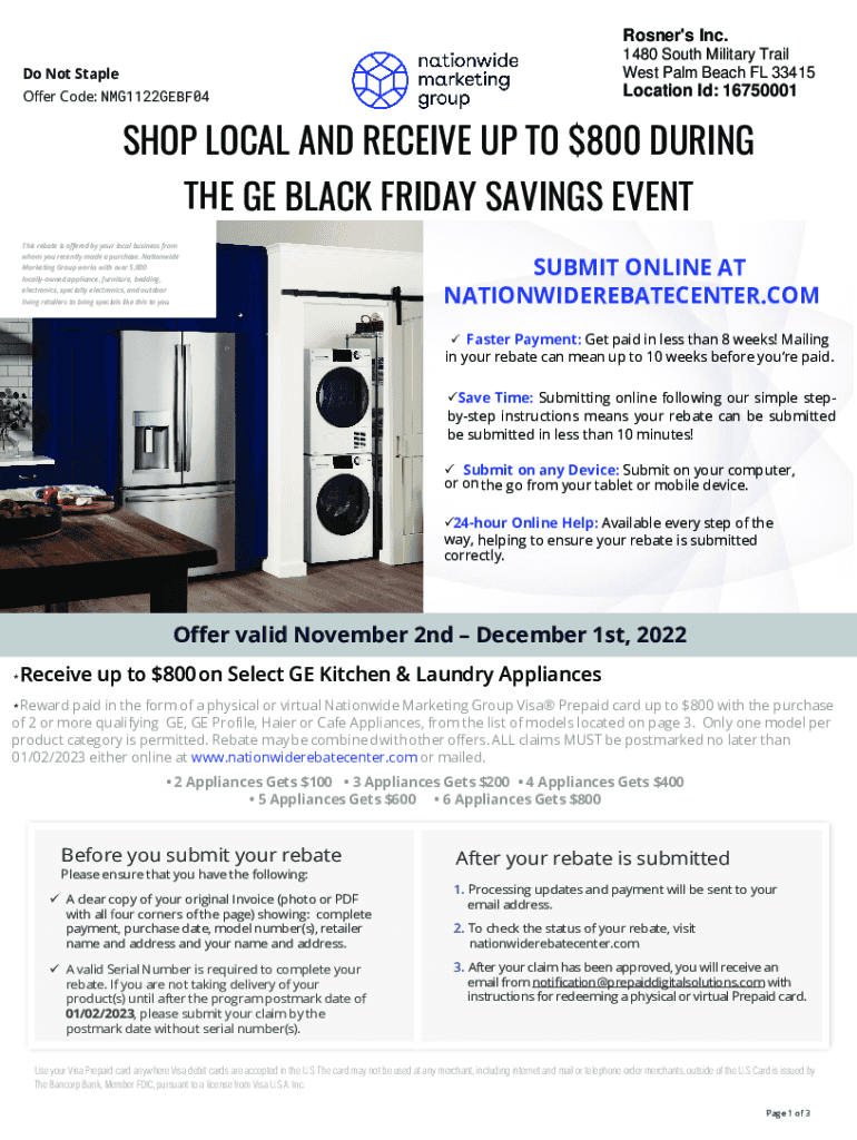 Roster\'s Inc. Do Not Staple1480 South Military Trail West Palm Beach FL 33415Oer Code: NMG1122GEBF04Location I'd: 16750001SHOP LOCAL AND RECEIVE UP TO $800 DURING THE GE BLACK FRIDAY SAVINGS Events