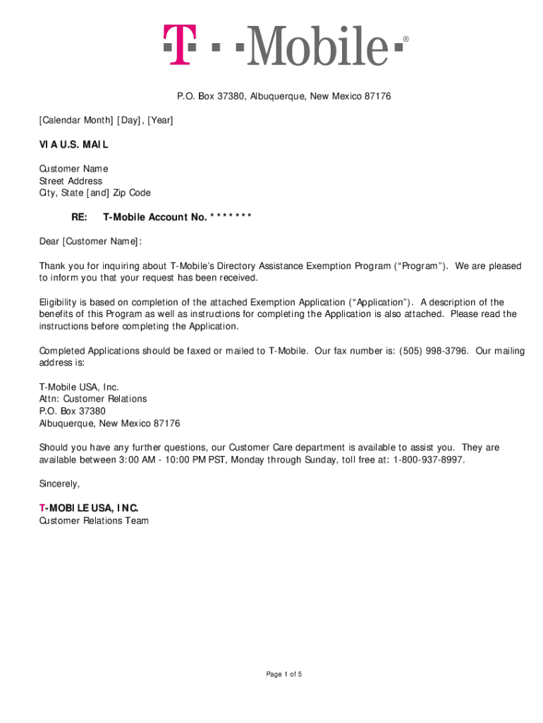 P.O. Box 37380, Albuquerque, New Mexico 87176 [Calendar Month] [Day], [Year] VIA U.S. MAIL Customer Name Street Address City, State [and] Zip Code RE:Mobile Account No. *******Dear [Customer Name]: