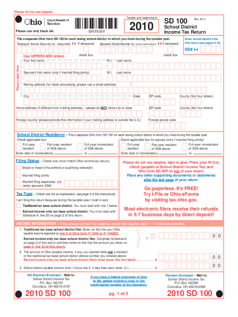 Please do not use staples. Taxable year beginning in201010020102Please use only black ink. School District Income Tax Returnable a separate Ohio form SD 100 for each taxing school district in which