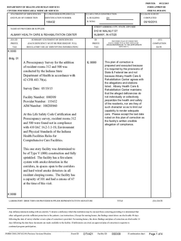 PRINTED: DEPARTMENT OF HEALTH AND HUMAN SERVICES CENTERS FOR MEDICARE & MEDICAID SERVICES STATEMENT OF DEFICIENCIES(X1) PROVIDER/SUPPLIER/LIGAND PLAN OF CORRECTIONIDENTIFICATION NUMBER:15543209/22/2015FORM