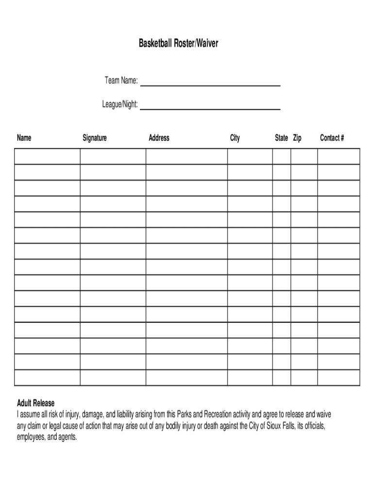 Basketball Roster/Waiver Team Name: League/Night:NameSignatureAddressCityStateZipContact #Adult Release I assume all risk of injury, damage, and liability arising from these Parks and Recreation activity