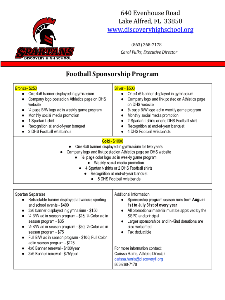 Football Sponsorship Program Bronze $250 One 4×6 banner displayed in gymnasium Company logo posted on Athletics page on DHS website page B/W logo ad in weekly game program Monthly social media promotion