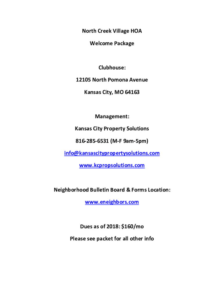 NorthCreekVillageHOA WelcomePackageClubhouse: 12105NorthPomonaAvenue KansasCity,MO64163Management: KansasCityPropertySolutions 8162856531(MF9am5pm) info@kansascitypropertysolutions.com www.kcpropsolutions.comNeighborhoodBulletinBoard&FormsLocation: