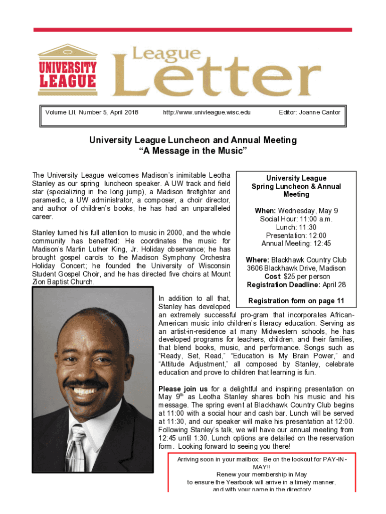 Volume LII, Number 5, April 2018http://www.univleague.wisc.eduEditor: Joanne CantorUniversity League Luncheon and Annual Meeting A Message in the Music The University League welcomes Madison's inimitable