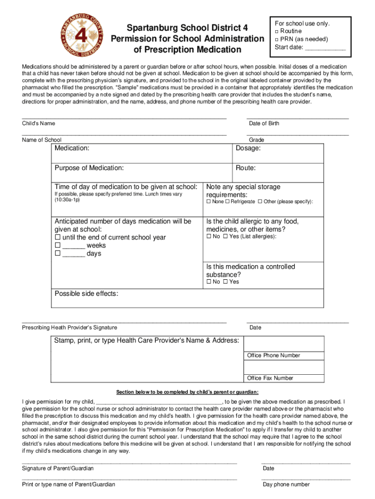 Spartanburg School District 4 Permission for School Administration of Prescription Medication school use only. Routine PRN (as needed) Start date: ___Medications should be administered by a parent