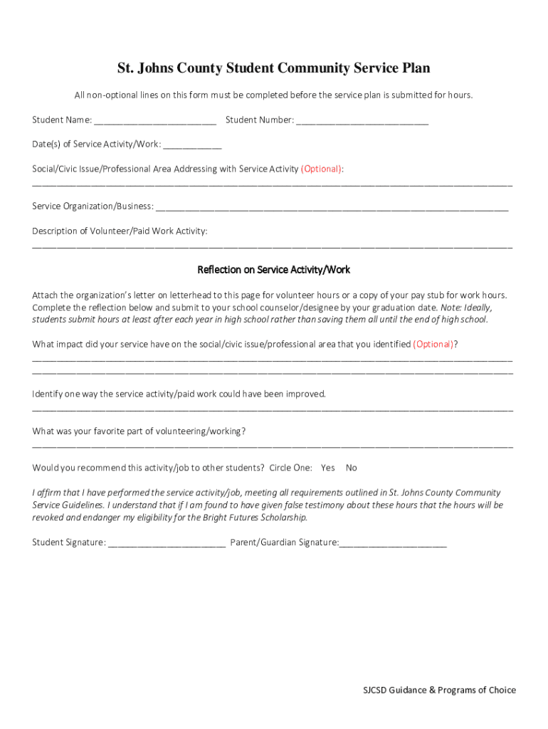Students must report details of their volunteer service activities, including the organization served, dates of service, and hours completed.