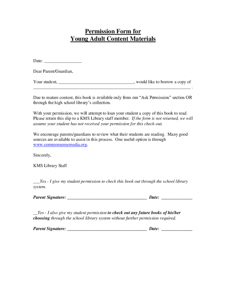 Permission Form for Young Adult Content MaterialsDate: ___ Dear Parent/Guardian, Your student, ___, would like to borrow a copy of ___. Due to mature content, this book is available only from our