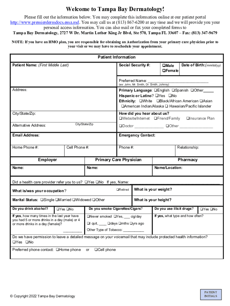 Welcome to Tampa Bay Dermatology! Please fill out the information below. You may complete this information online at our patient portal http://www.premierdermdocs.ema.md. You may call us at (813)
