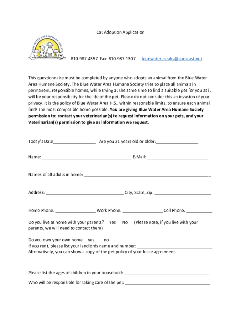 Cat Adoption Application8109874357 Fax: 8109871307bluewaterareahs@comcast.netThis questionnaire must be completed by anyone who adopts an animal from the Blue Water Area Humane Society. The Blue Water