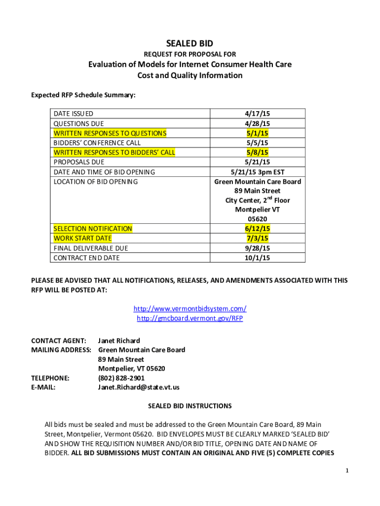 SEALED BID REQUEST FOR PROPOSAL FOREvaluation of Models for Internet Consumer Health Care Cost and Quality Information Expected RFP Schedule Summary: DATE ISSUED QUESTIONS DUE WRITTEN RESPONSES TO