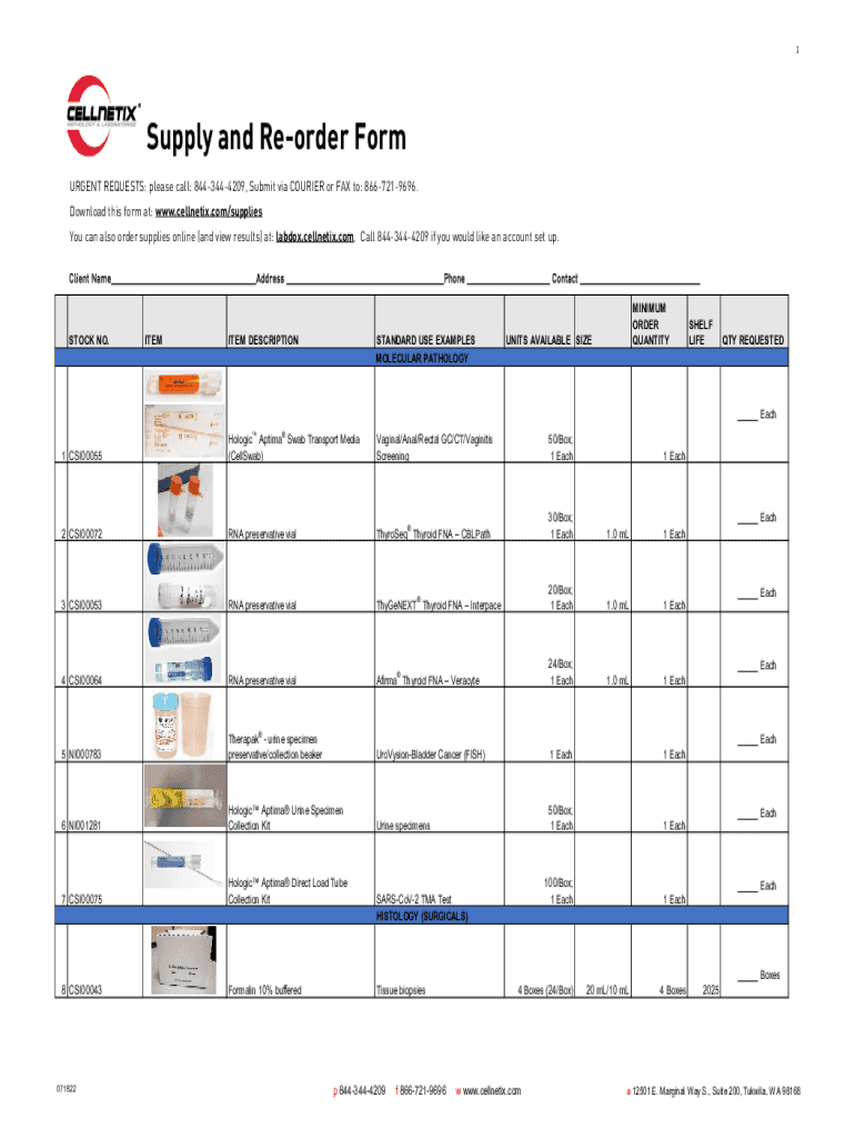 1Supply and Reorder Form URGENT REQUESTS: please call: 8443444209, Submit via COURIER or FAX to: 8667219696. Download this form at: www.cellnetix.com/supplies You can also order supplies online (and
