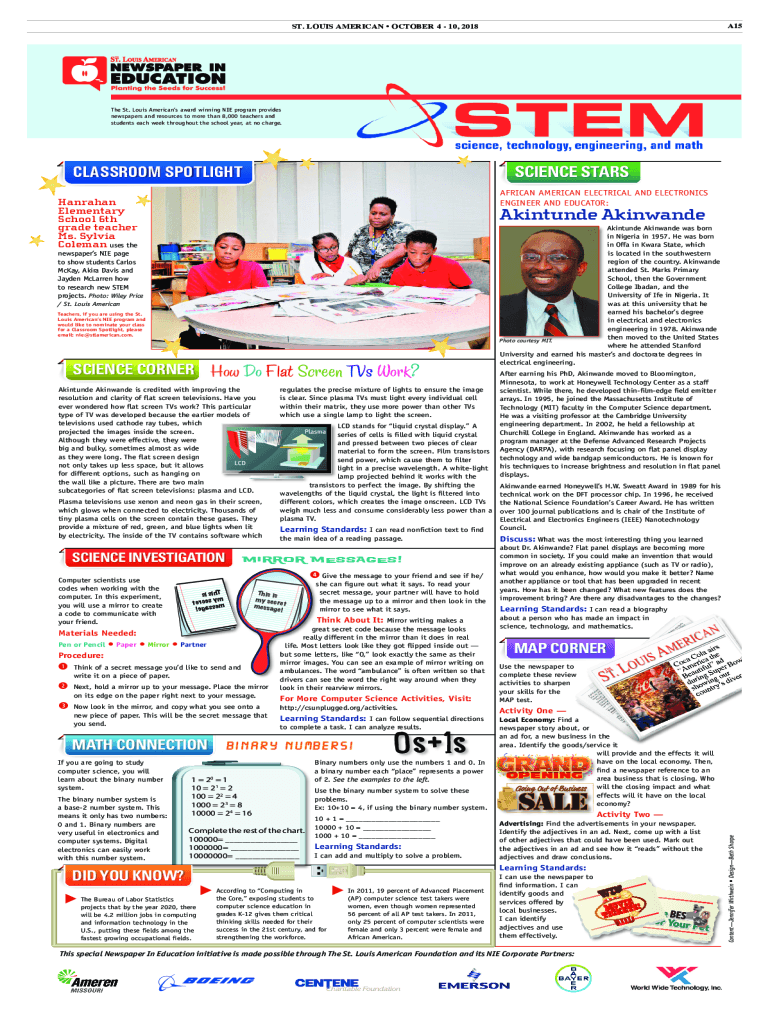A15ST. LOUIS AMERICAN OCTOBER 4 10, 2018The St. Louis Americans award-winning NICE program provides newspapers and resources to more than 8,000 teachers and students each week throughout the school
