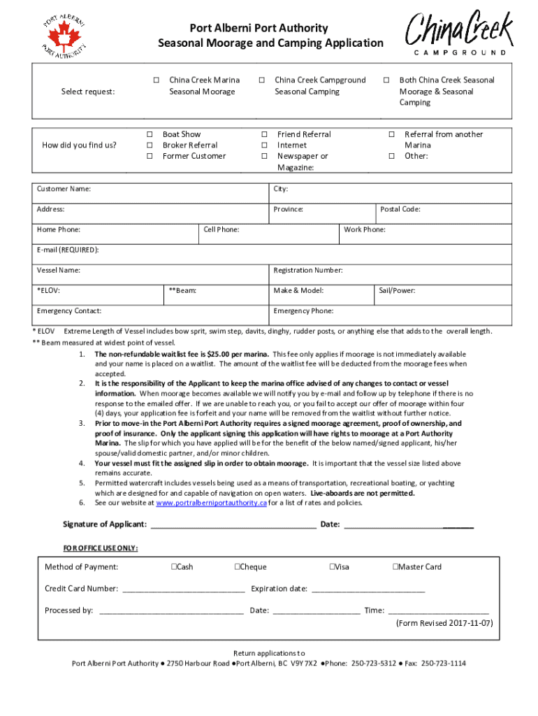 Port Albert Port Authority Seasonal Moo rage and Camping Application Select request:How did you find us? China Creek Marina Seasonal MoorageBoat Show Broker Referral Former Customer China Creek Campground