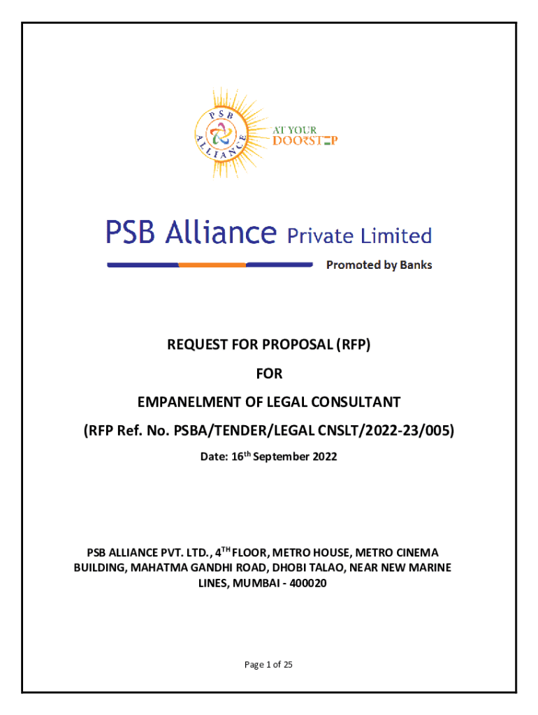 REQUEST FOR PROPOSAL (RFP) FOR EMBANKMENT OF LEGAL CONSULTANT (RFP Ref. No. PBA/TENDER/LEGAL CN SLT/202223/005) Date: 16th September 2022PSB ALLIANCE PVT. LTD., 4TH FLOOR, METRO HOUSE, METRO CINEMA