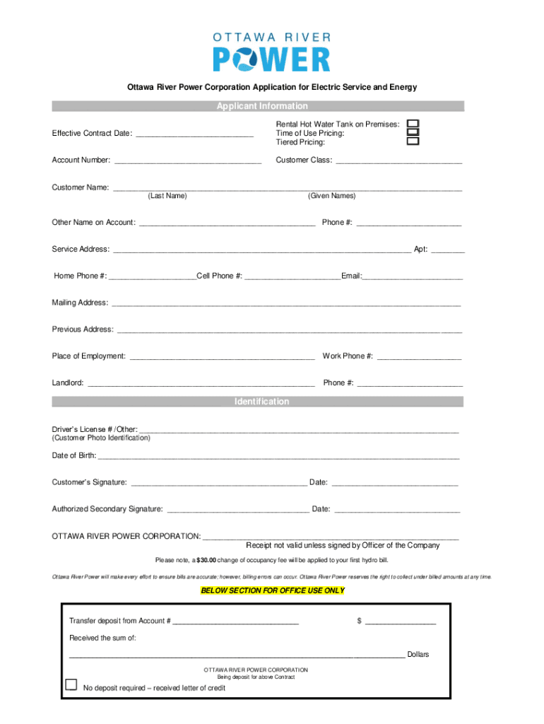 Ottawa River Power Corporation Application for Electric Service and Energy ___ Applicant Information___ Effective Contract Date: ___Rental Hot Water Tank on Premises: Time of Use Pricing: Tiered Pricing:Account