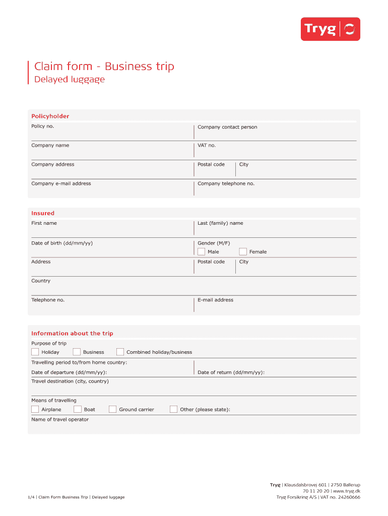 Claim form Business trip Delayed luggage Policyholder Policy no. Company contact person Company name VAT no. Company address Postal code Company e-mail address Company telephone no. City Insured First