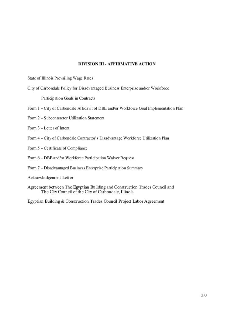 DIVISION III AFFIRMATIVE ACTION State of Illinois Prevailing Wage Rates City of Carbondale Policy for Disadvantaged Business Enterprise and/or Workforce Participation Goals in Contracts Form 1 City