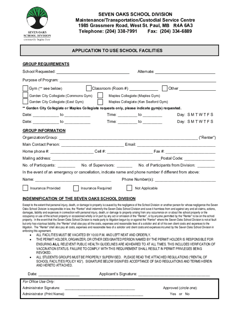 SEVEN OAKS SCHOOL DIVISION Maintenance/Transportation/Custodial Service Center 1985 Grass mere Road, West St. Paul, MB R4A 6A3 Telephone: (204) 3387991 Fax: (204) 3346889APPLICATION TO USE SCHOOL