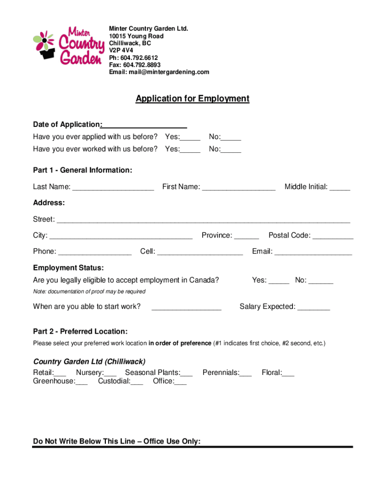 Minter Country Garden Ltd. 10015 Young Road Chilliwack, BC V2P 4V4 pH: 604.792.6612 Fax: 604.792.8893 Email: mail@mintergardening.comApplication for Employment Date of Application: Have you ever applied