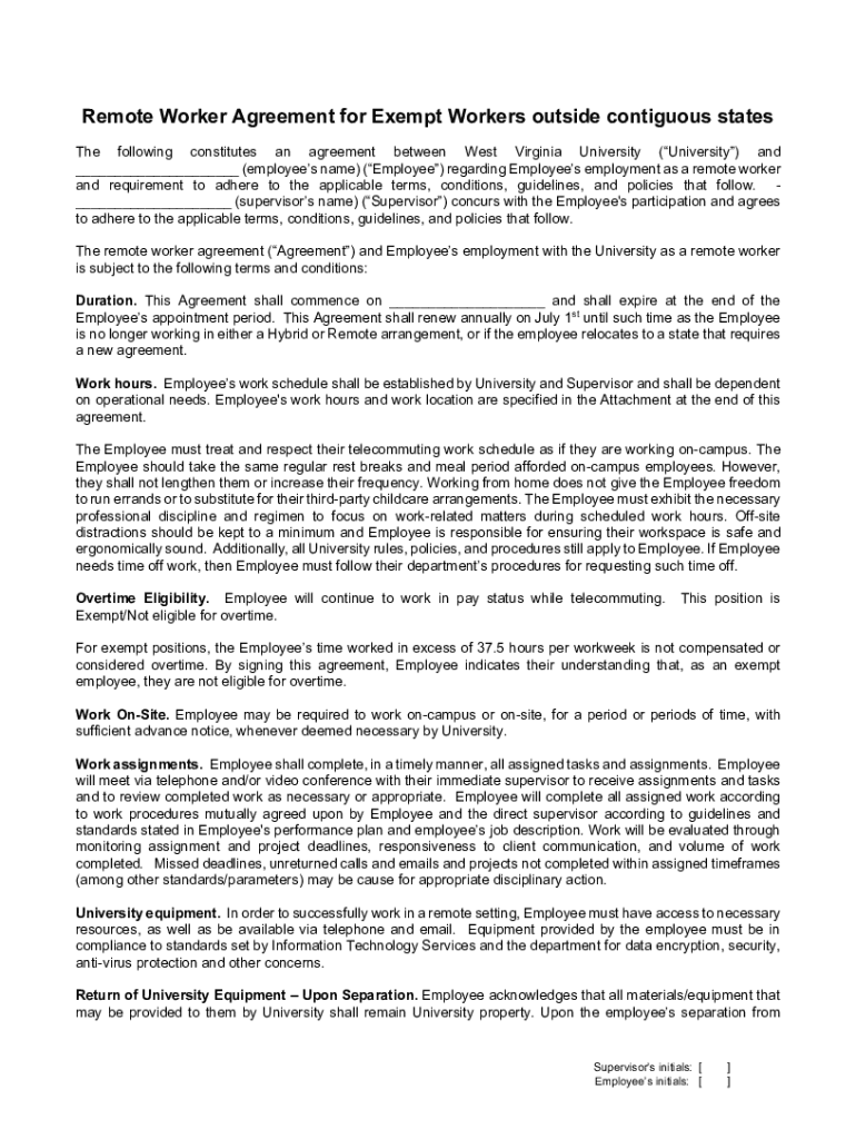 Remote Worker Agreement for Exempt Workers outside contiguous states The following constitutes an agreement between West Virginia University (University) and ___ (employees name) (Employee) regarding