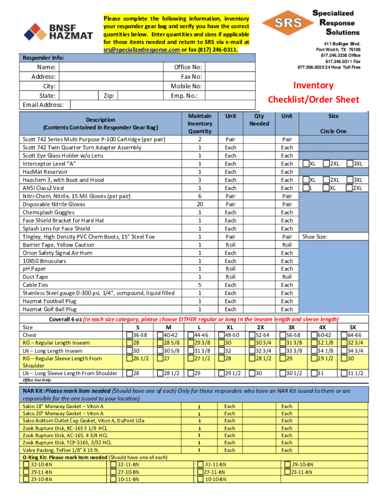 Please complete the following information, inventory your responder gear bag and verify you have the correct quantities below. Enter quantities and sizes if applicable for those items needed and return